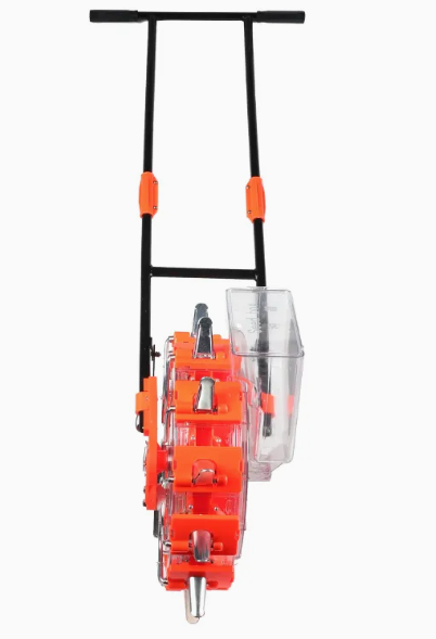 Den avståndsjusterbara manuella såmaskinen för handskjutning består av sex kärndelar: en precisionsavståndsregulator, en utsädesbehållare med hög kapacitet, ett slitstarkt såhjul, ett ergonomiskt körhandtag, en djupkontrollplatta och en jordtäckande borste. Avståndsregulatorn i den avståndsjusterbara manuella såmaskinen för handskjutbar majs är nyckelkomponenten, med tydliga skalor för enkel justering. Fröbehållaren på Distance Adjustable Manual Hand Push Corn Seeder är gjord av anti-aging plast, hållbar och lätt. Såhjulet är inlindat i gummi för att undvika att halka på leriga fält, vilket säkerställer stabil drift. Körhandtaget är täckt med halkfritt skum, vilket minskar handtröttheten vid långvarig användning. Djupkontrollplattan och den jordtäckande borsten arbetar tillsammans för att säkerställa att majsfrön planteras korrekt.