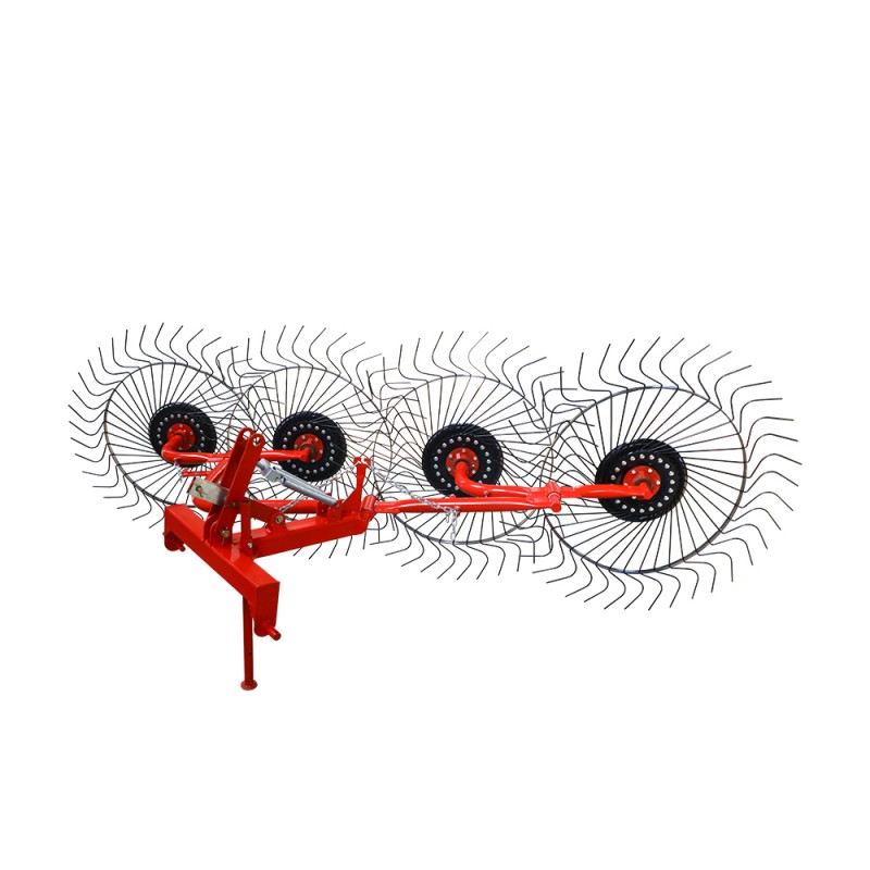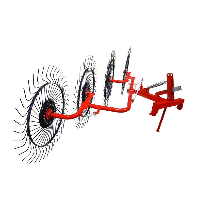 Arbetsprincipen för en hökratta på hjul är synkron kraftöverföring och mekanisk hökratning. Traktorns kraftuttagsaxel driver hjulen på Wheel Hay Rake. Hjulens rotation driver räfständerna, som samlar höet till enhetliga höbalar. Den justerbara räfsningsvinkeln (10°-48°) gör att höskrapan med hjul anpassar sig till olika terränglutningar. Säkerställ konsistens i höuppsamlingen. Även när den står inför vått och tungt hö förhindrar hökratans vridmomentfördelningssystem.