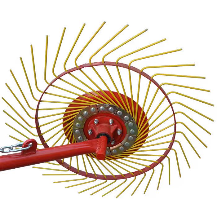 Hjulhö-räfsan drivs av dragkraft för att bilda grupper, och samtidigt justeras vinkeljusteringsanordningens kuggar till den förinställda arbetsvinkeln. När maskinen rör sig framåt kommer den elastiska tanden att tränga in i bottenlagret av fodret, plocka upp det utspridda fodret och samla det på mitten. Under den framåtgående rörelsen håller gånghjulen maskinen stabila, vilket förhindrar att raktänderna skadar grässtammarna på grund av ojämn mark, och i slutändan bildar en enhetlig och fluffig gräsmatta för att efterfölja balning av gräset, för att därefter torka gräset.
